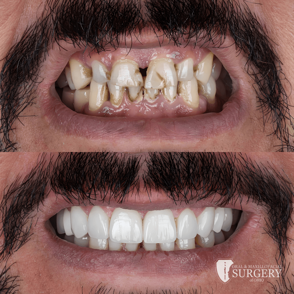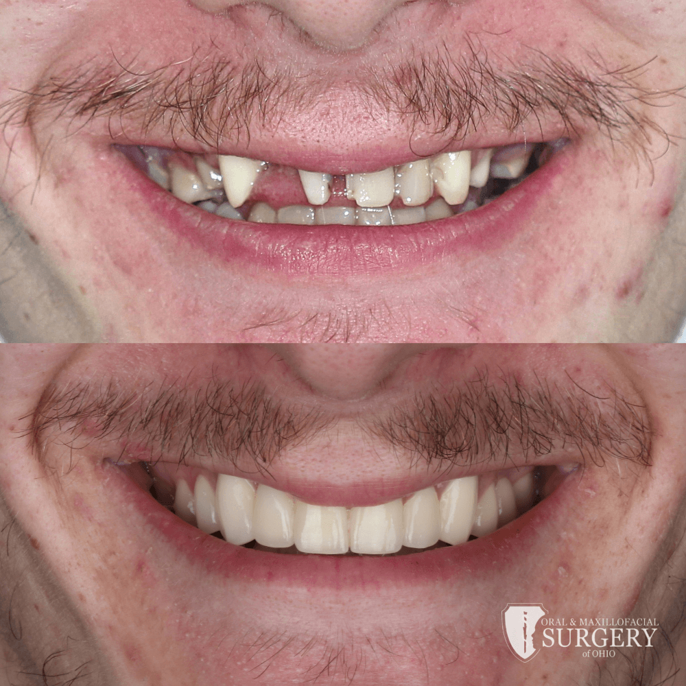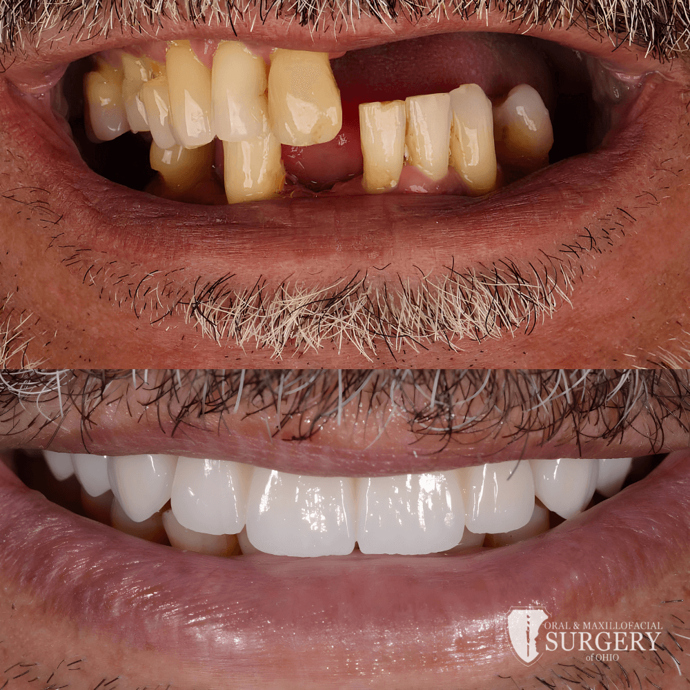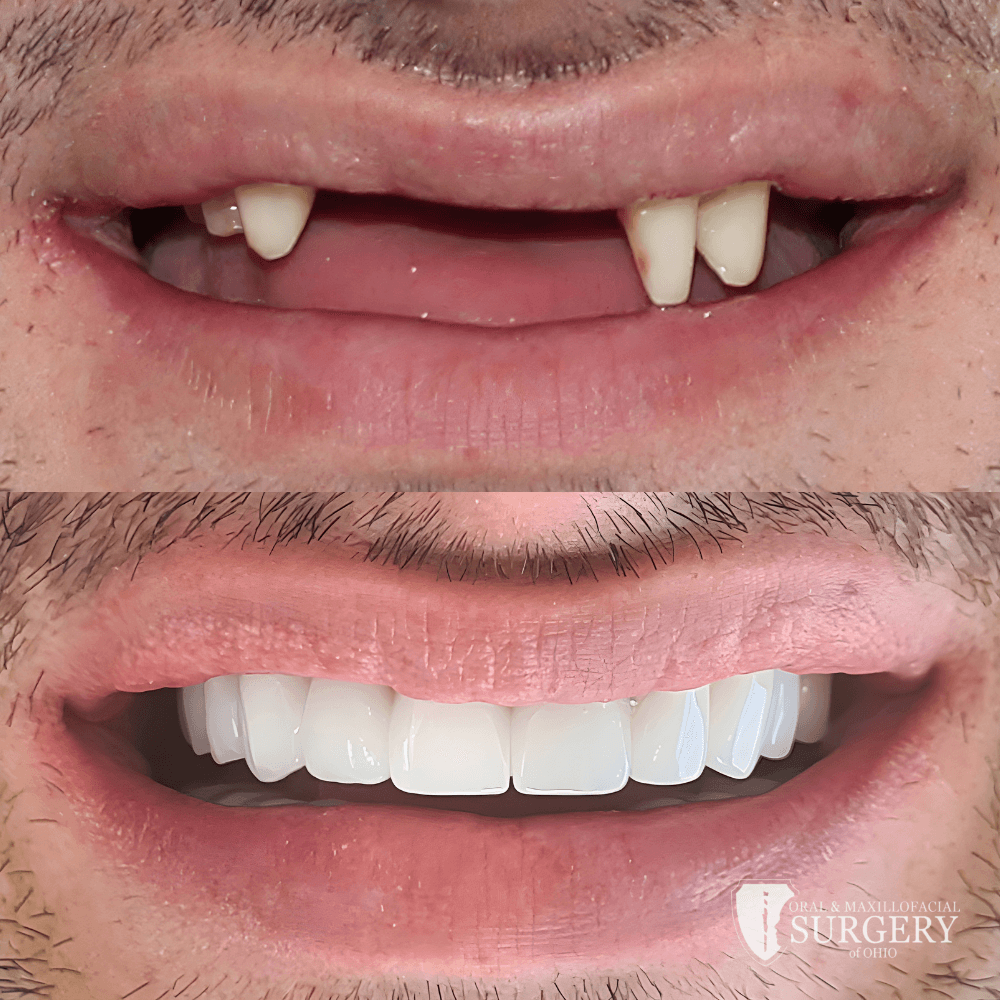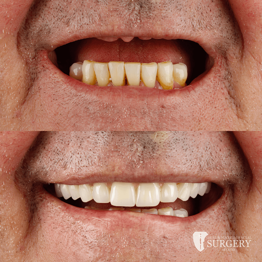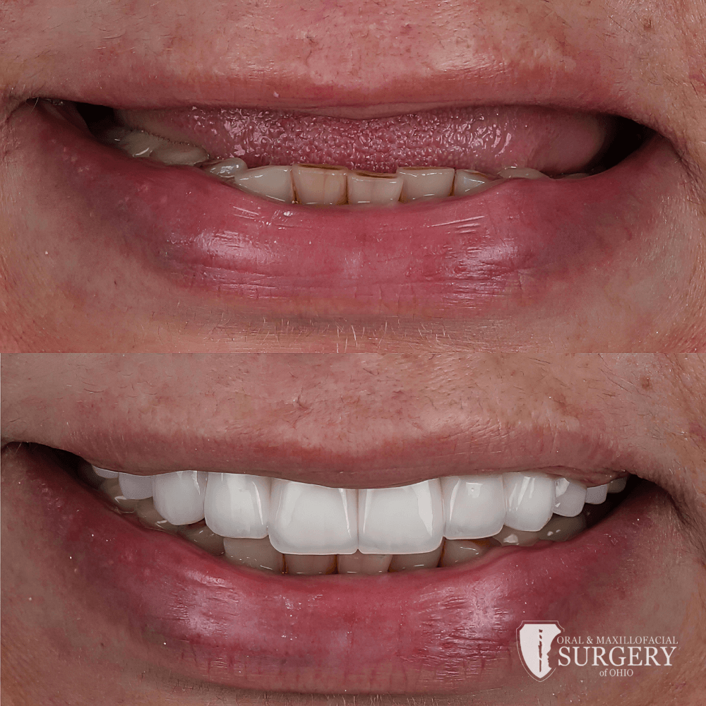 The full procedure is done in a single day. After the implants are placed, a temporary set of teeth is attached immediately, so you walk out with a full smile. A permanent, custom set is placed once healing is complete.